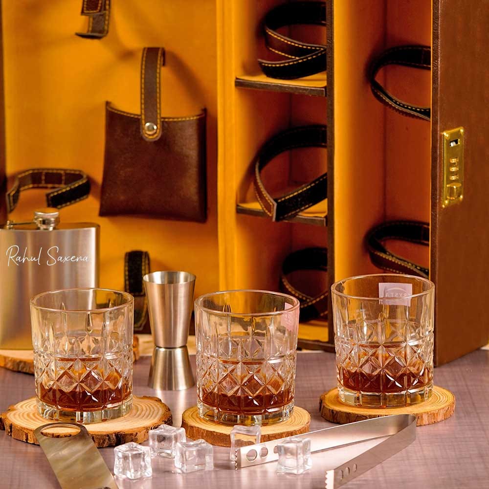 • 3 luxury whisky glasses with bar accessories included