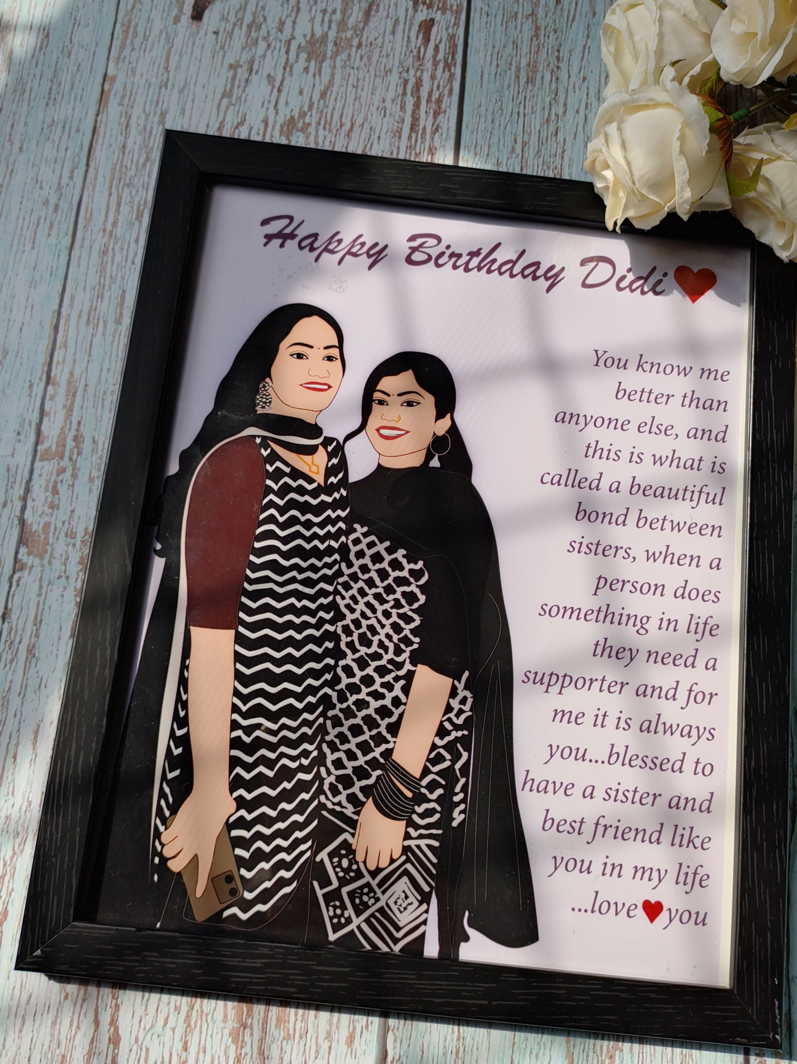The "Sisterly Serenade" is not just a frame; it's a timeless keepsake that encapsulates the warmth and love you have for your sister. Whether it's a birthday, anniversary, or just a spontaneous gesture, this personalized frame is the ideal way to express your gratitude for having a sister cum best friend who stands by you through thick and thin.