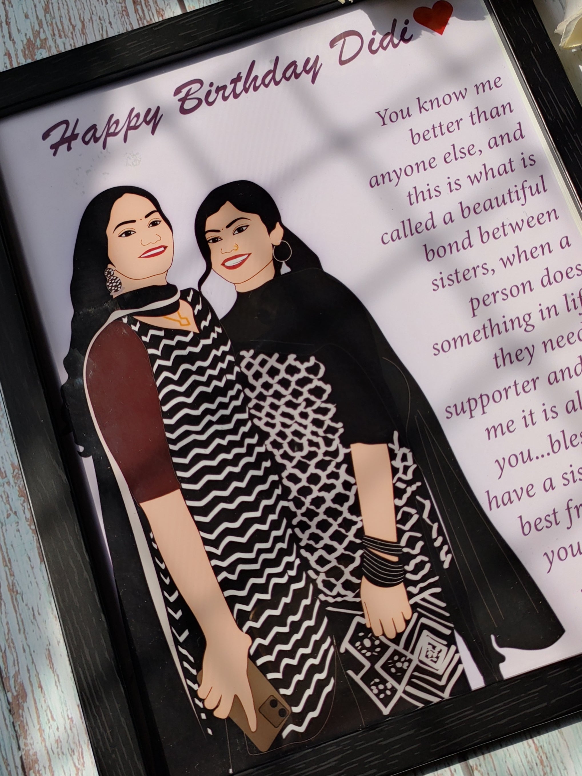 What sets "Sisterly Serenade" apart is the personal touch you get to add. Not only can you choose the frame's border color from our available options, but you also have the opportunity to include a detailed message that speaks volumes about your bond. Express your feelings, share an inside joke, or recall a cherished memory – the choice is yours!