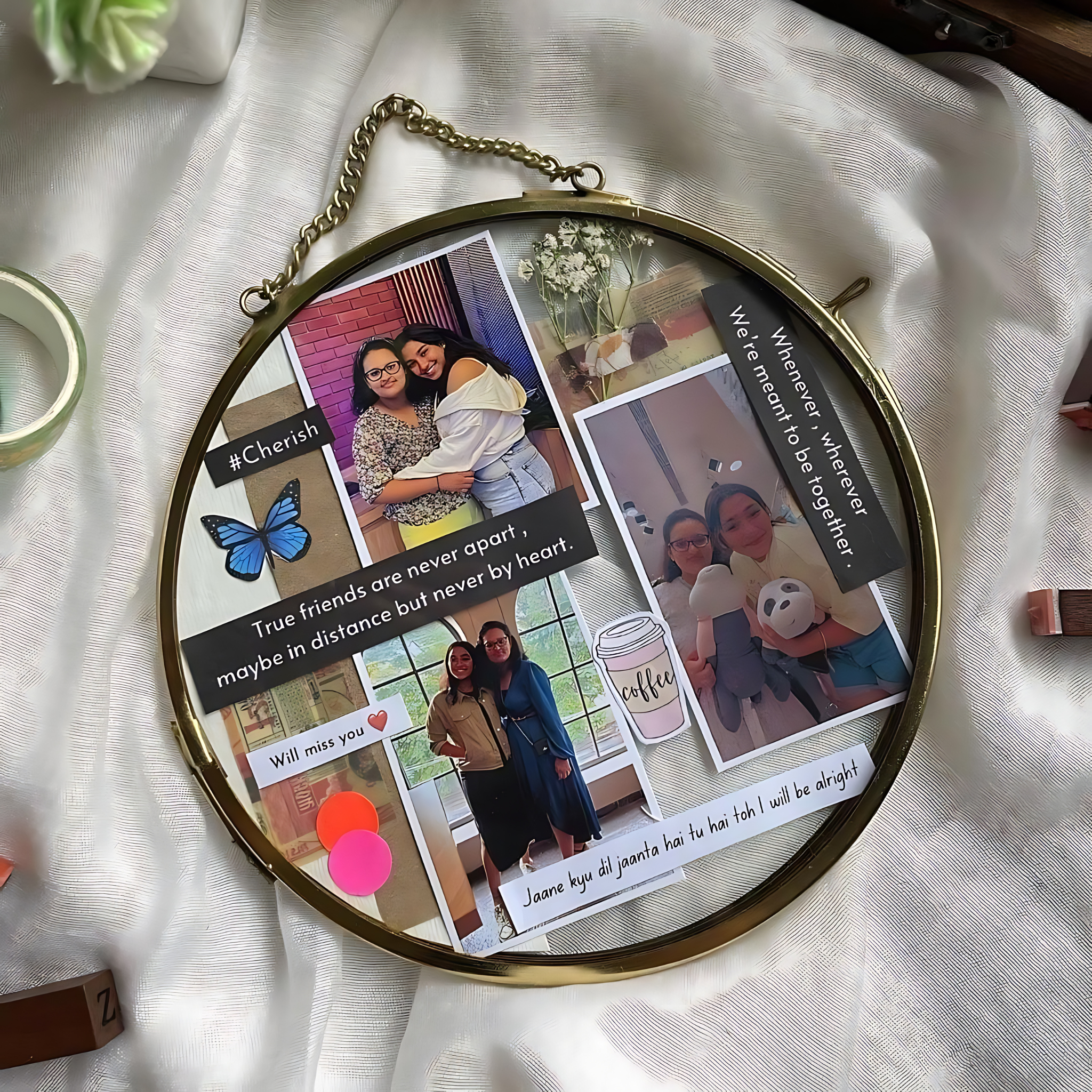 Celebrate the essence of friendship with our Friendship Theme Based Personalised Vintage Frame. This charming 7-inch round frame is designed to capture and showcase your most cherished memories. With space for three pictures and an option to add a personalized message, it’s the perfect friendship day gift to express your love and appreciation for your best friend.