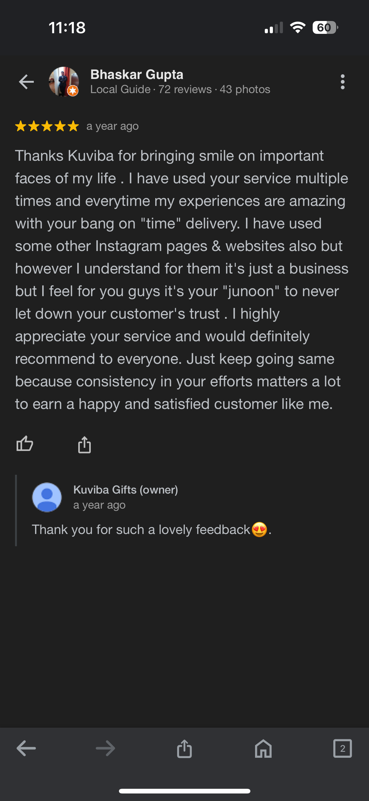 Pause for a moment to explore the genuine testimonials and uncover the feelings shared by satisfied customers of Gifts By Kuviba Gifts about their outstanding experiences. Immerse yourself in a plethora of feedback and observe the trust our patrons have in us for their gifting requirements. Examine the elements contributing to their steadfast confidence as you browse through these priceless testimonials.